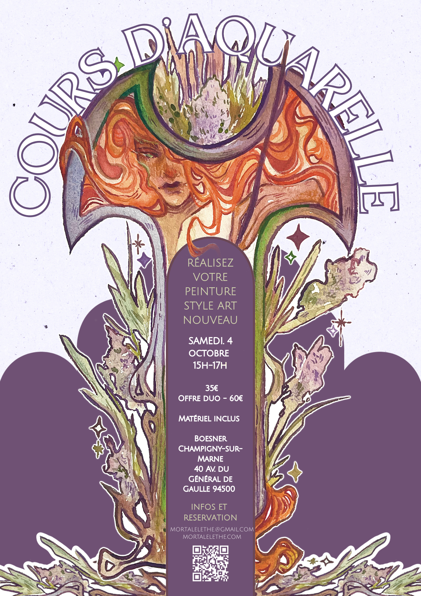 Bienvenue dans cet atelier de deux heures pour y (re)découvrir l’aquarelle dans un style floral et onirique hérité du XIXeme siècle : l’Art Nouveau